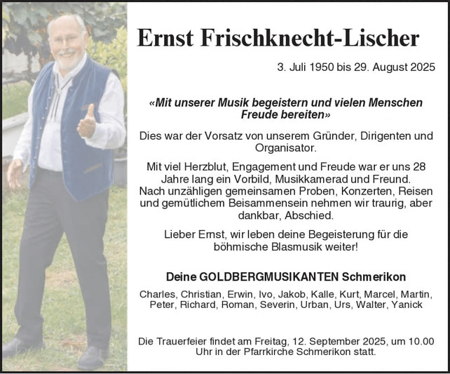 Die «Goldbergmusikanten Schmerikon unter der Leitung von Ernst Frischknecht» wird es so nicht mehr geben. Ernst möchte sich auf diesem Weg bei der
